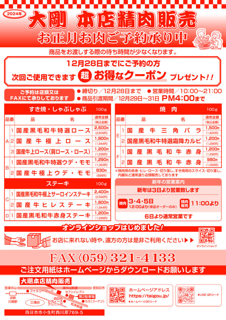 本店生肉販売所にてお正月お肉のご予約を承っております。